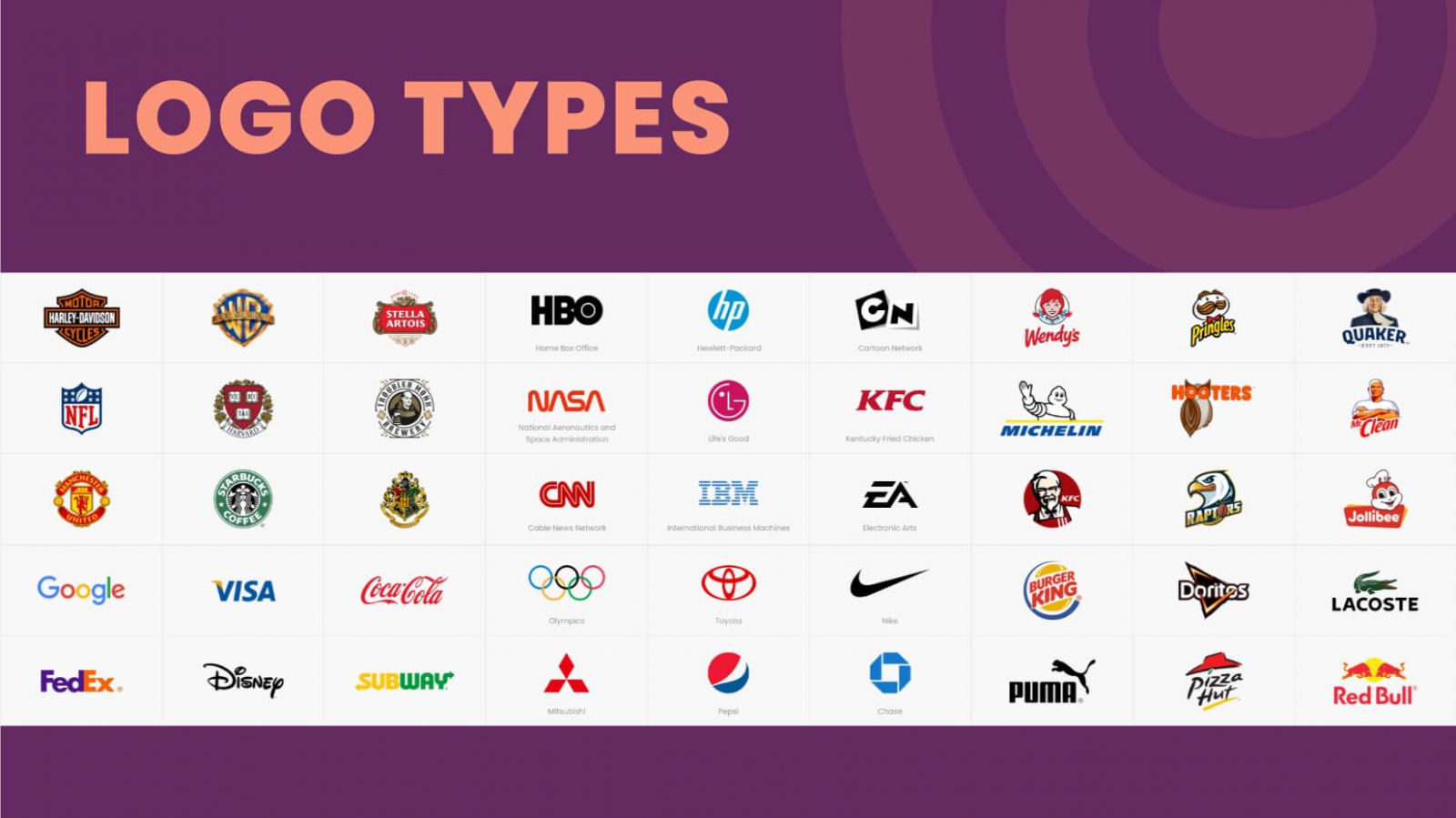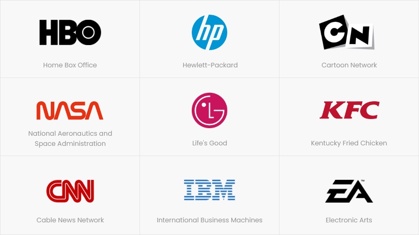 Logo các thương hiệu: HBO, HP, CN, NASA, LG, KFC, CNN, IBM, EA