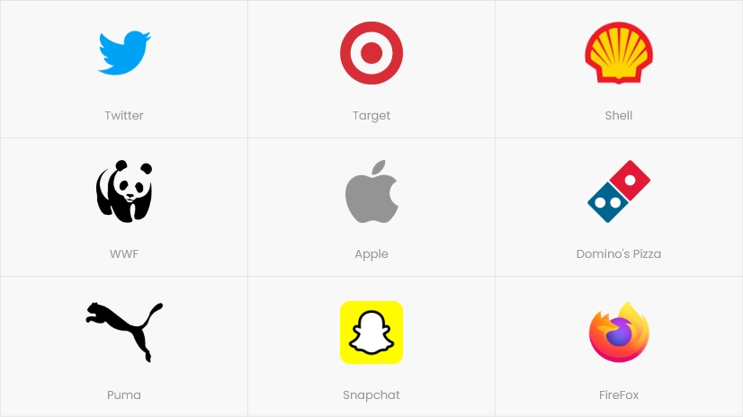 Logo thương hiệu: Twitter, Target, Shell, WWF, Apple, Domino’s Pizza, Puma, Snapchat, FireFox