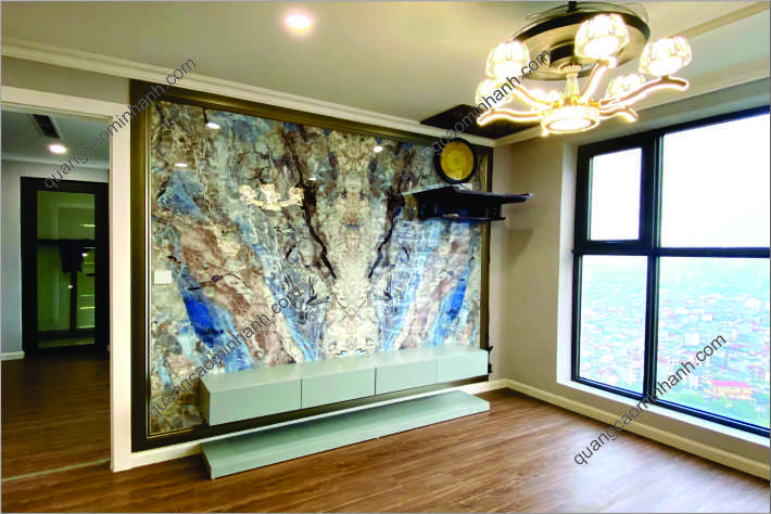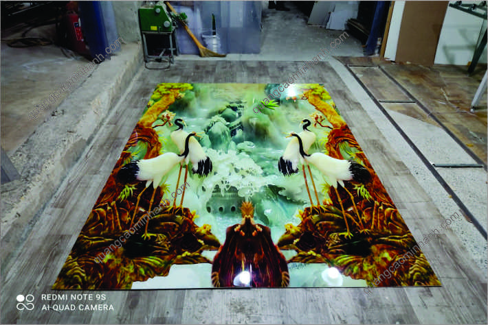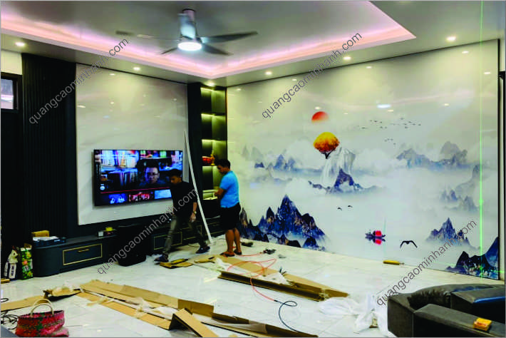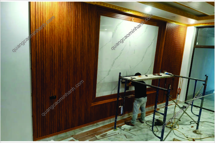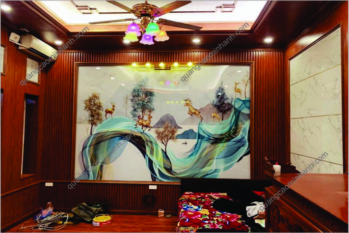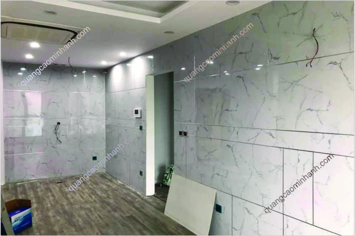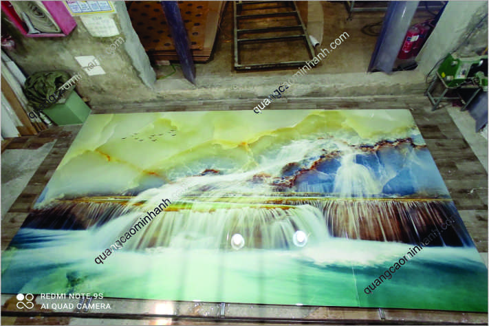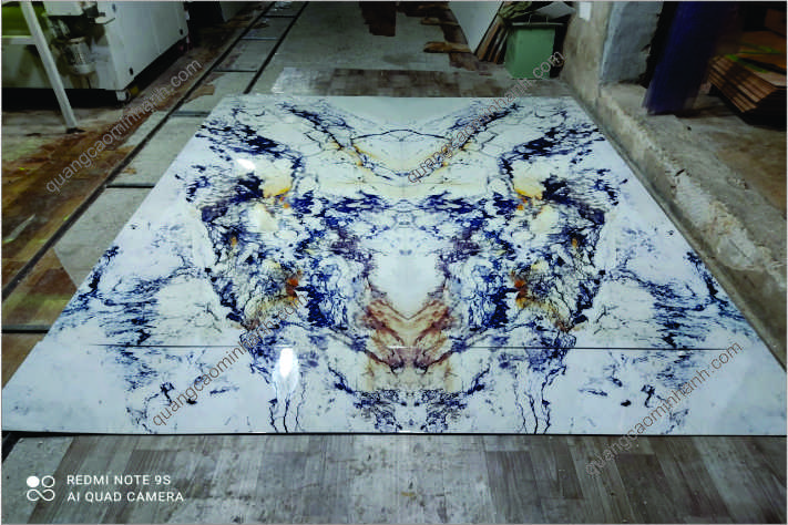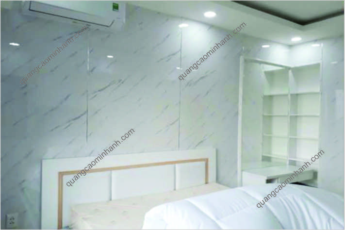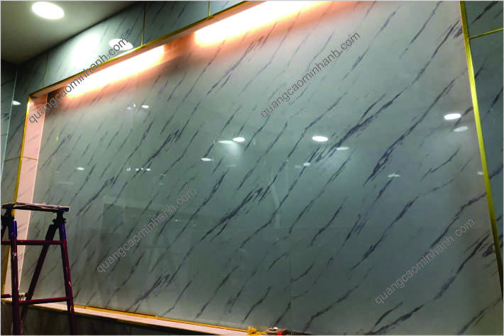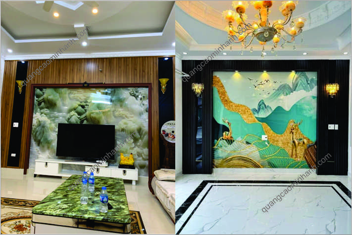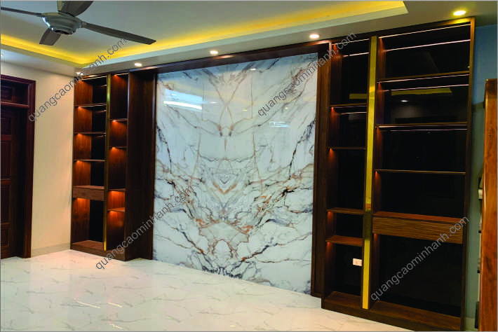 Đây là hình thức in trực tiếp lên tấm PVC vân đá bằng công nghệ in UV phủ gương cao cấp. Giá thánh cao hơn sử dụng tấm pvc nguyên bản, nhưng tạo sự độc đáo, sang trọng và ấn tượng đặc biệt. Thường được sử dụng ốp tại các phòng khách, phòng trưng bày...