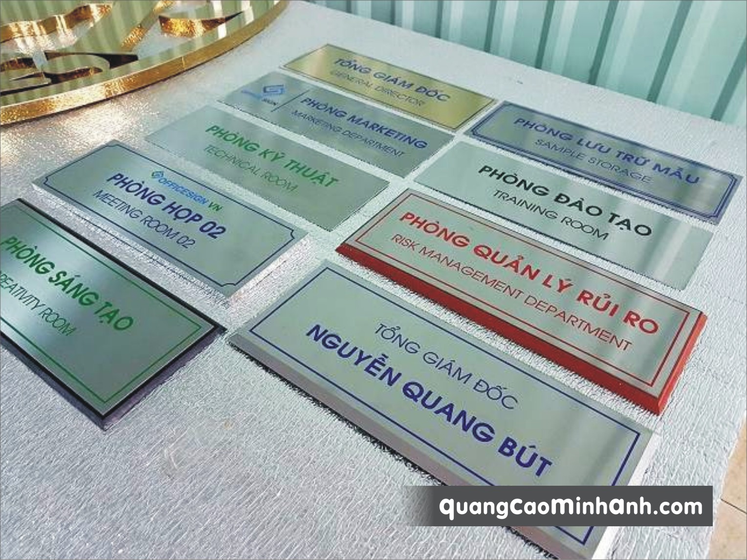 Biển phòng ban công ty quảng cáo Minh Anh được sử dụng từ nhiều chất liệu: mica (acrylic), alumi, inox, đồng, gỗ...kết hợp với các công nghệ hiện đại. Có nhiều mẫu mã và phân khúc, đảm bảo phục vụ tất cả các yêu cầu của khách hàng.